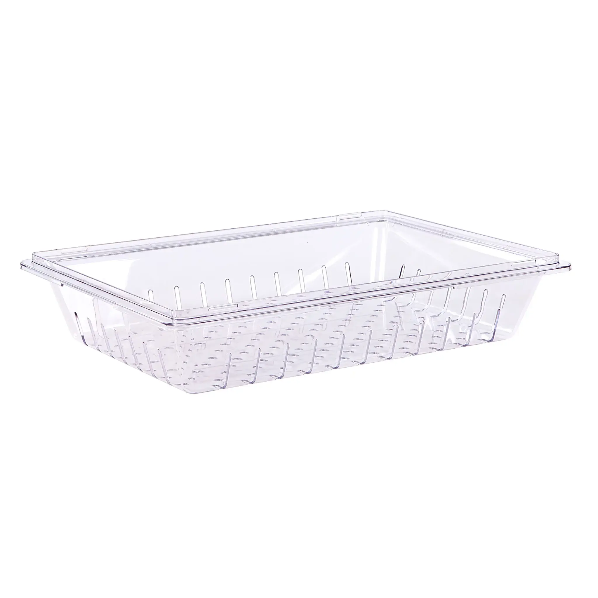 Stay ahead in the competitive landscape with Carlisle's Food Pan Colander. Designed for commercial restaurant use, this colander is a must-have for any professional kitchen. With a rectangular shape and perforated and slotted design, it efficiently drains excess liquid from food while keeping it intact. The stackable feature allows for easy storage, saving valuable space in your kitchen. Made from durable polycarbonate, this colander is dishwasher safe and built to withstand the demands of a busy restaurant environment. Its clear design ensures visibility, making it easy to identify the contents. NSF certified and proudly made in the USA, you can trust the quality and authenticity of this product. Upgrade your kitchen with Carlisle's Food Pan Colander and experience the convenience and efficiency it brings to your food preparation process.